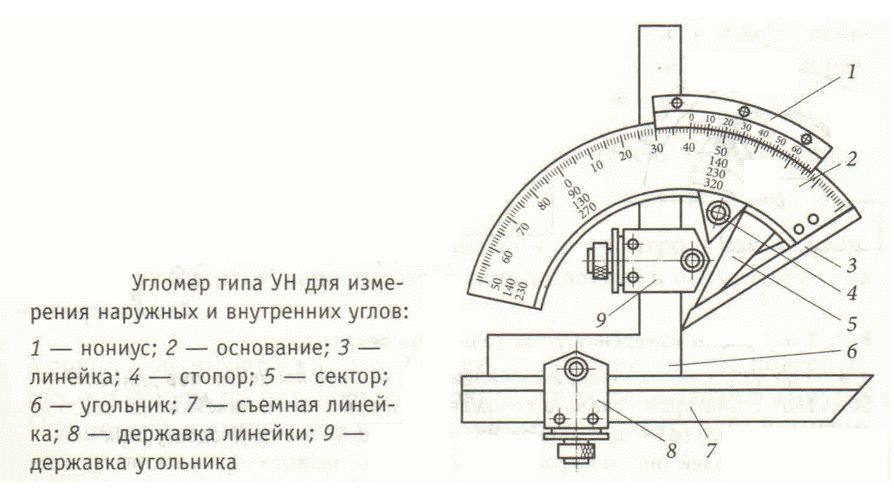 Угломер с нониусом является многомерным инструментом, предназначенным для измерения наружных и внутренних углов с точностью измерения до 2′. Такой угломер применяется для проверки только чисто обработанных поверхностей.