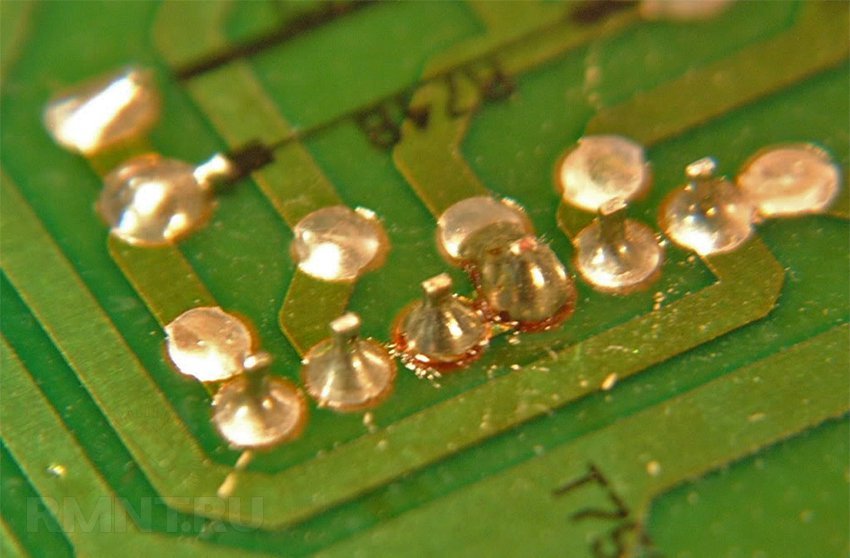 Выводные элементы (которые с ножками) паять проще всего. Они предварительно неподвижно фиксируются (пластилином, воском) выводами в отверстиях платы. Затем с обратной стороны паяльник плотно прижимается к хвосту для его прогрева, после чего в место спайки вводится проволочка припоя, содержащего флюс. Слишком много олова не нужно, достаточно чтобы оно затекло в лунку со всех сторон и образовало некое подобие вытянутого колпака.