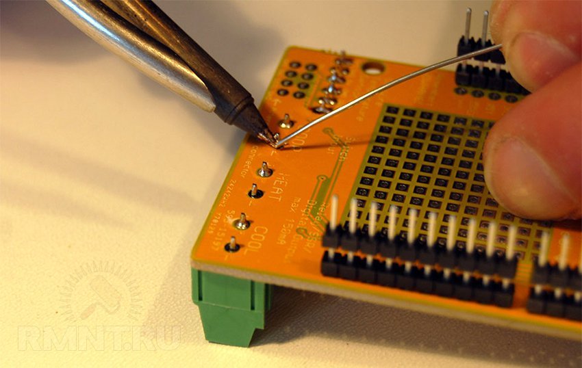 - Припаять концы проволоки и вывод сопротивления к плате, с дугой стороны припаять провода от блока питания