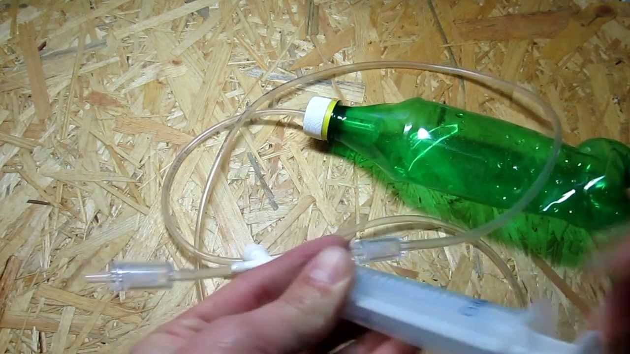 - К выводу клапана, чья стрелка направлена к шприцу, подключите трубку, ведущую к объекту вакуумирования. Проверить работу помпы можно литровой пластиковой бутылкой.