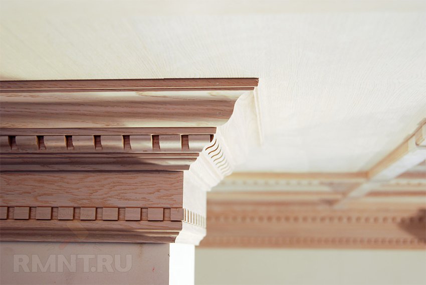 - Затем из любого подходящего материала изготавливают уголки для потолочного плинтуса – из двух реек, например. Материал вставляют в элемент как в стусло.