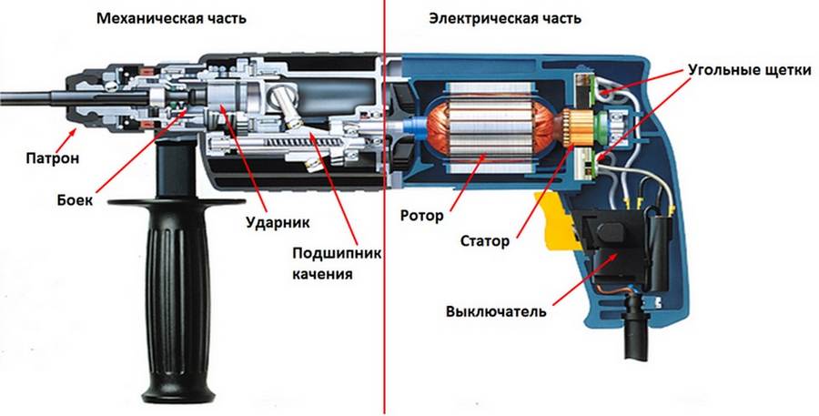 На картинке видно, как устроена дрель: возвратно-поступательное движение патрону придают храповые колёса, прыгающие друг по другу при вращении. При сверлении это ощущается как небольшая вибрация инструмента. Чтобы получить хоть какой-то эффект, надо вжимать дрель в стену с усилием 10-15 килограммов.