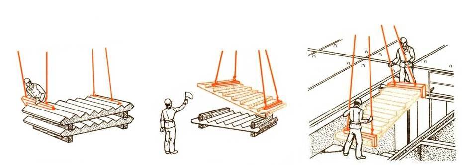 Также лестничный марш ложится ребром, что при контакте может привести к повреждению панели перекрытия или самого марша. Поэтому монтаж панели лестничного марша целесообразнее производить с наклоном панели, в этом случае данные риски будут минимальны.