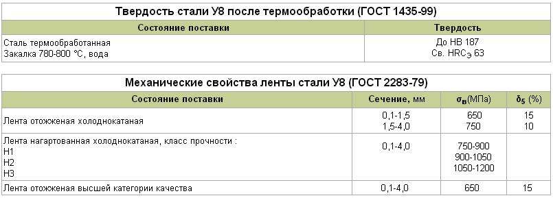 Имея в своём химическом составе 0,75…0,85% углерода, а также незначительное количество иных элементов – кремния, марганца, хрома, никеля и меди – сталь У8 является эктектоидной. При пониженном содержании марганца и кремния критическая скорость охлаждения всегда увеличивается. Поэтому практически сталь У8 используют лишь для изготовления металлообрабатывающего инструмента с небольшими габаритными размерами. Закалка стали такого типа допускает применение весьма жёстких охлаждающих сред (воды или водных растворов солей). Таким образом, данная сталь не относится к прокаливаемым: сердцевина остаётся вязкой, а твёрдость, полученная в результате предварительного отжига заготовок, практически такой же и остаётся.