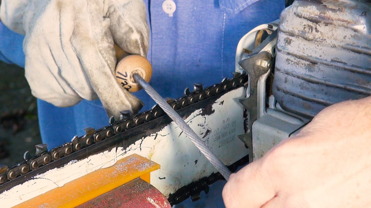 Вот пошаговая инструкция, как точить цепь бензопилы напильником: