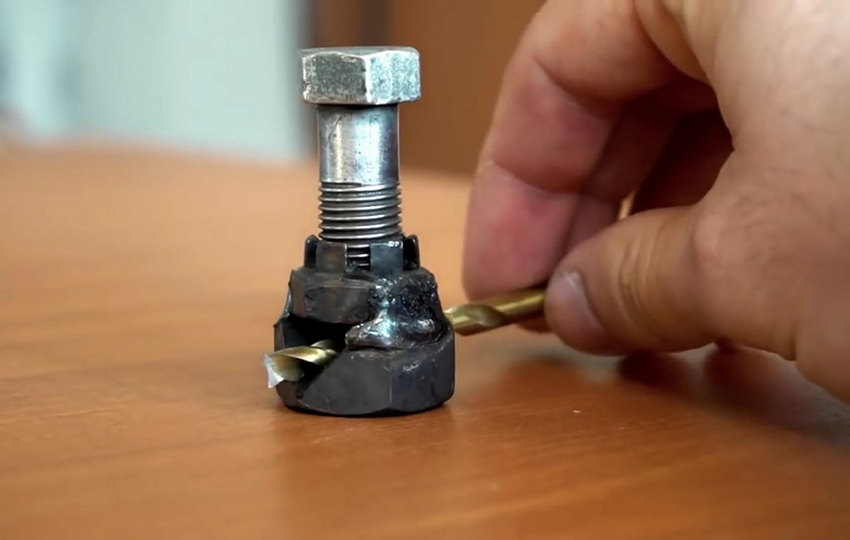 - Сверху приваривается еще одна гайка диаметром поменьше. Она понадобится, чтобы вкрутить прижимоной болт.